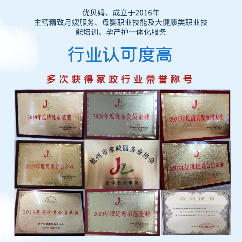 杭州優(yōu)貝姆健康管理有限公司,成立于2016年,是一家致力于打造集定制居家月嫂服務(wù)、孕產(chǎn)護(hù)一體化服務(wù)、母嬰健康管理培訓(xùn)學(xué)校為一體的現(xiàn)代化母嬰健康管理企業(yè)。 連續(xù)多年被浙江省家政協(xié)會(huì)及杭州市家政協(xié)會(huì)評(píng)為:“優(yōu)秀會(huì)員單位”“家政示范企業(yè)”“特殊貢獻(xiàn)獎(jiǎng)”等殊榮。 多次在浙江省家政技能比賽中獲得優(yōu)異成績,并代表浙江省參加“長三角家政技能大賽”并取得優(yōu)異成績。
